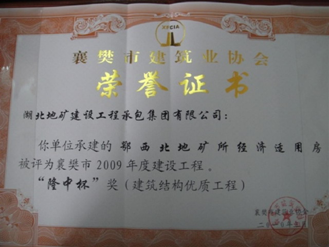 3月30日上午,在襄樊市南山宾馆召开的全市工程建设管理工作会议上,由地建承包公司总包承建的鄂西北所经济适用房被襄樊市建筑业协会评为2009年建筑工程“隆中杯”(建筑结构优质工程)奖。
